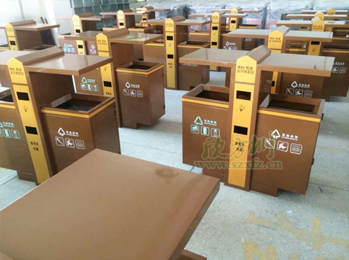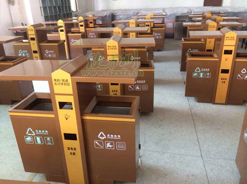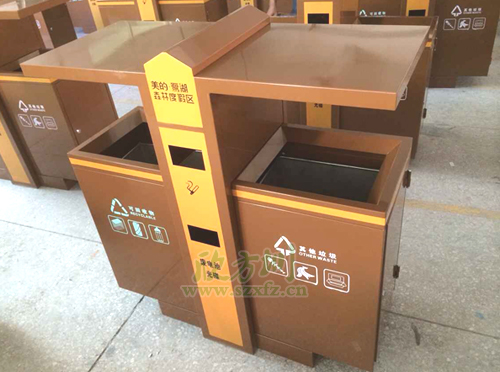 土豪金垃圾桶獨(dú)特設(shè)計(jì)風(fēng)格F238戶(hù)外分類(lèi)垃圾桶,外桶為足1.2mm鍍鋅板,表面噴塑工藝,內(nèi)膽為201#,厚足0.75mm, 螺絲螺母為304不銹鋼材質(zhì),采用不銹鋼膨脹螺 安裝。噴塑顏色為土豪金色,垃圾桶開(kāi)口位置坐折邊處理,箱體帶簡(jiǎn)易防盜鎖。左右兩邊分別絲印,可回收物,其他垃圾等圖案標(biāo)志。中間橙黃色區(qū)域,印有美的·鷺湖森林度假區(qū),廢電池光碟字樣,字體顏色為土豪金色。欣方圳工程師采用金色的獨(dú)特性的設(shè)計(jì)風(fēng)格,特別受到物業(yè),房地產(chǎn),機(jī)場(chǎng),小區(qū)等單位的青睞。
