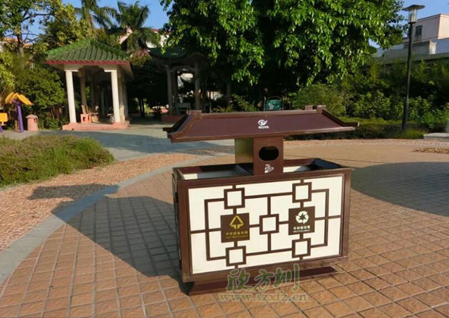 最近剛接到廣西桂林市的市容園林局來電,詢問適合放在街道兩邊的垃圾桶,相關(guān)負(fù)責(zé)人稱,為了提升一二類道路的形象,要求款式特別一點,經(jīng)我們的推薦,客戶再三挑選,最終選中了我們欣方圳垃圾桶廠家精心設(shè)計定做的這款中國風(fēng)分類垃圾桶,就是以下這款款式新穎典雅的復(fù)古中國風(fēng)垃圾桶,鋼制垃圾桶雖是藏污納垢之處,但也體現(xiàn)了一個城市的形象,這樣有設(shè)計感的戶外垃圾桶確實很有特色。更環(huán)保安全呢!