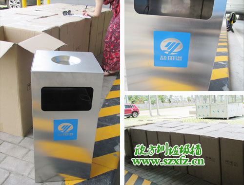 本款不銹鋼垃圾桶是按照貴司的常規(guī)熱銷款C60方形不銹鋼果皮箱改造而來的,其規(guī)格為:350*350*680mm。不銹鋼垃圾桶外觀不銹鋼色澤,常規(guī)不銹鋼垃圾桶桶部上面絲印有禁煙標志,按照顧客的要求改造為桶上方凹圓形槽,用于裝置煙灰頭。不銹鋼垃圾桶桶的正面,旁邊用藍色搭配絲印,鹽田港三個字及LOGO跟不銹鋼垃圾桶色澤一致,金屬亮澤 ,高雅美觀。