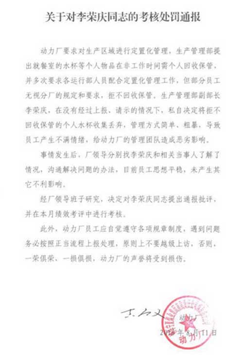 動力廠一名工作人員提供的一份《關(guān)于對李榮慶同志的考核處罰通報》顯示,該廠生產(chǎn)管理部提出就餐室的水杯等個人物品在非工作時間由個人回收保管,但部分員工無視此規(guī)定和要求,拒不回收保管。李榮慶在沒有經(jīng)過上報請示的情況下,私自決定將拒不回收保管的個人水杯收集丟棄,管理方式簡單粗暴,導致員工產(chǎn)生不滿情緒,給動力廠的管理團隊造成惡劣影響。