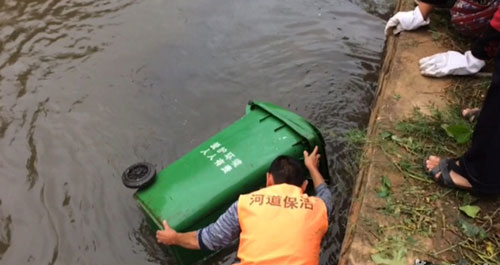 無辜垃圾桶被人拋下河 環(huán)衛(wèi)工人冒險(xiǎn)打撈