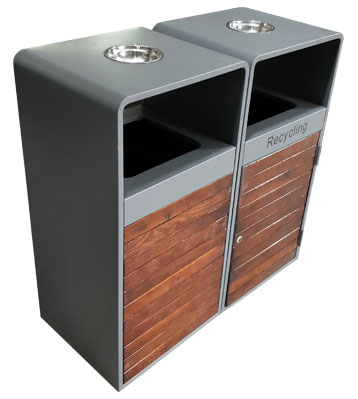 鋼木分類果皮箱桶頂嵌入煙灰盅,加入小石子可做戶外廣場(chǎng)等公共區(qū)域滅煙裝置及煙蒂收集使用,能減少環(huán)衛(wèi)工清掃強(qiáng)度,圓弧邊角避免防撞,深灰色搭配鋼木顏色美觀大氣!