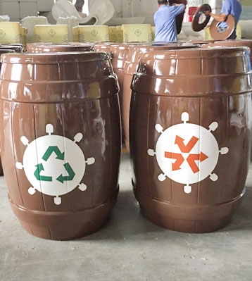 景區(qū)玻璃鋼仿木桶組合分類垃圾桶廠家批量生產(chǎn)圖