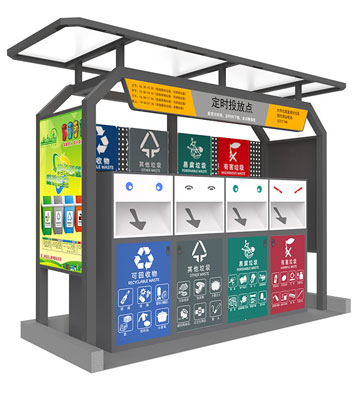 設(shè)有擋雨棚,可配備垃圾箱信息顯示屏、防水照明燈、廣告屏,進(jìn)行地面硬化。對(duì)社區(qū)玻金塑紙可回收物,其他垃圾,廚余垃圾,有害垃圾等生活垃圾定時(shí)定點(diǎn)投放收集.