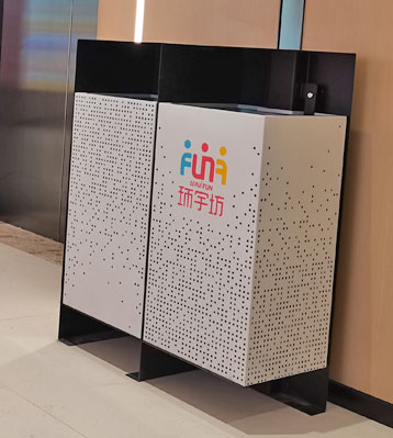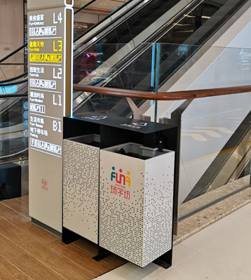 欣方圳商場不銹鋼烤漆景觀分類垃圾箱現(xiàn)場擺放圖
